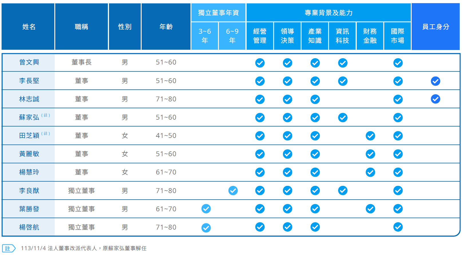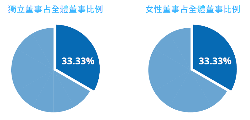 本屆董事成員具本公司員工身分之董事共2 名;占比為22.22%,女性董事共3 名;女性董事占比33.33%,已達成本公司設定(1) 兼任公司經理人之董事不超過董事席次三分之一及(2) 董事會成員至少包含一名女性董事之多元化政策具體管理目標。