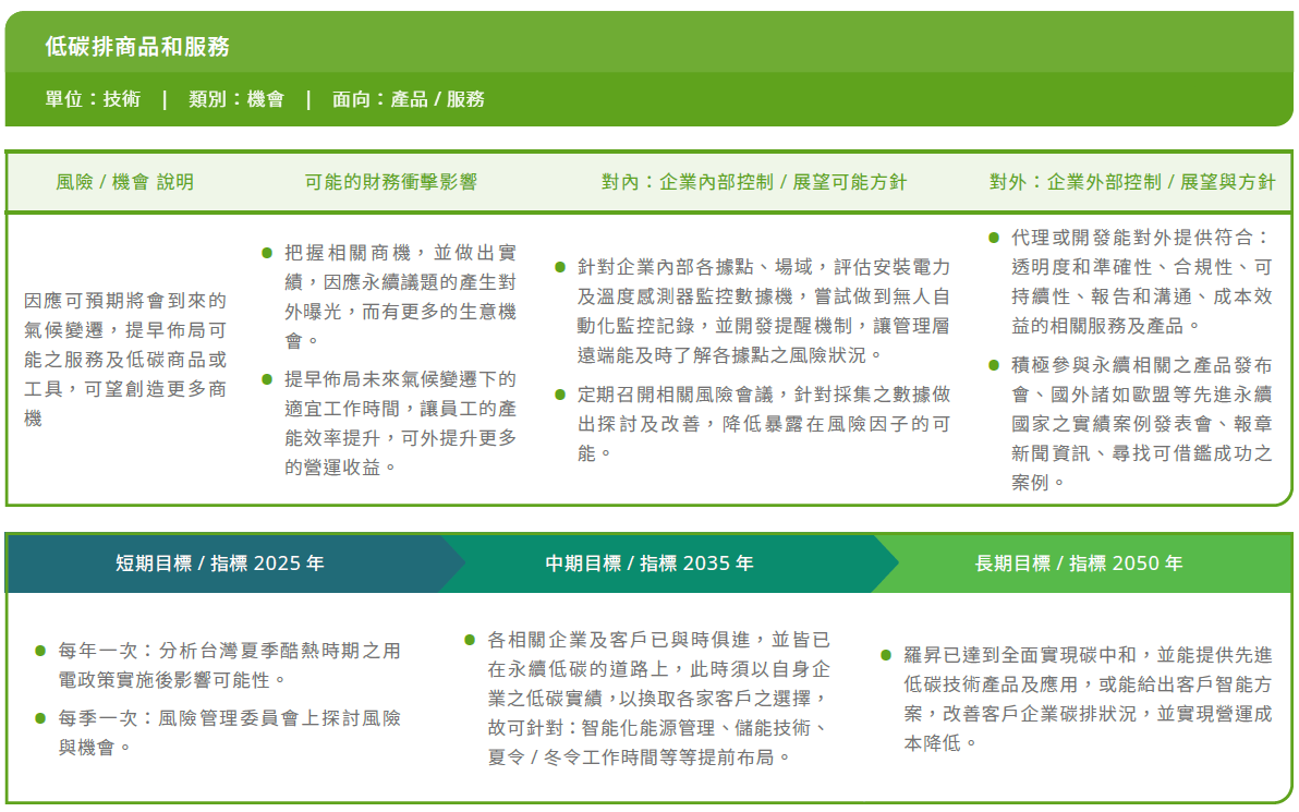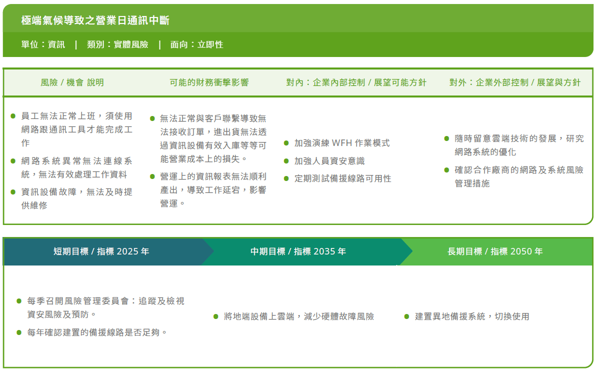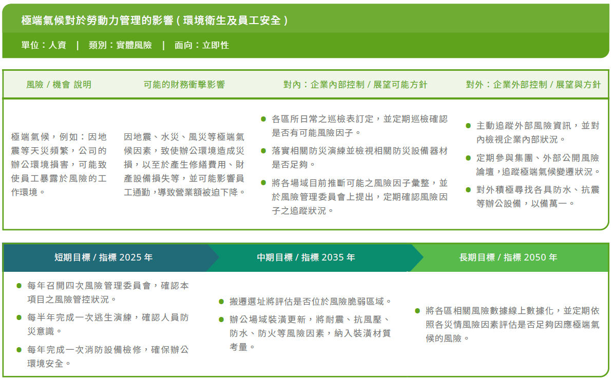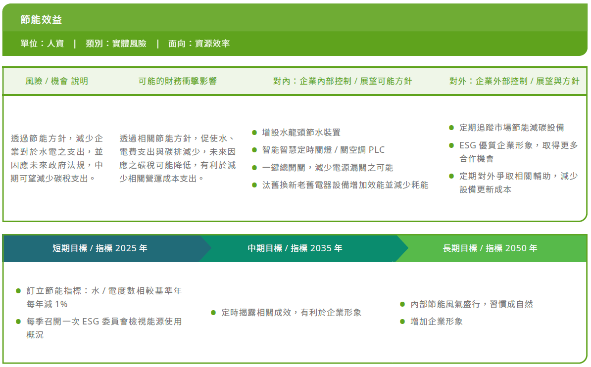 面對全球氣候變遷,本公司於2024 年依循氣候相關財務揭露框架(TCFD),鑑別可能對營運造成的重大性風險與機會,提出其相關應對策略,且訂定可持續管理之氣候相關指標與目標,為公司創造更大的利益與價值。