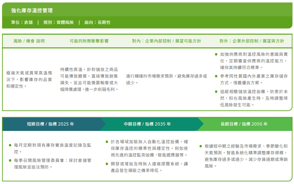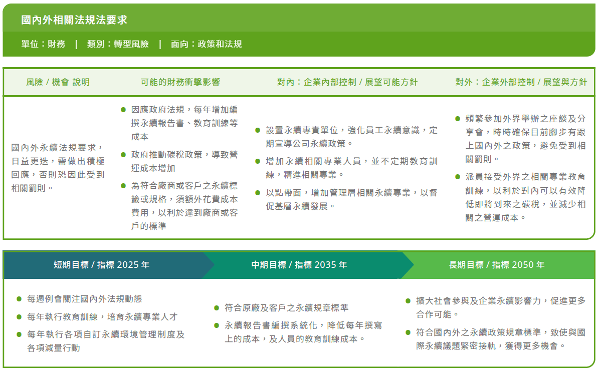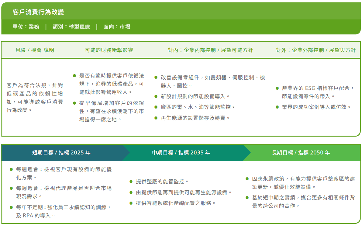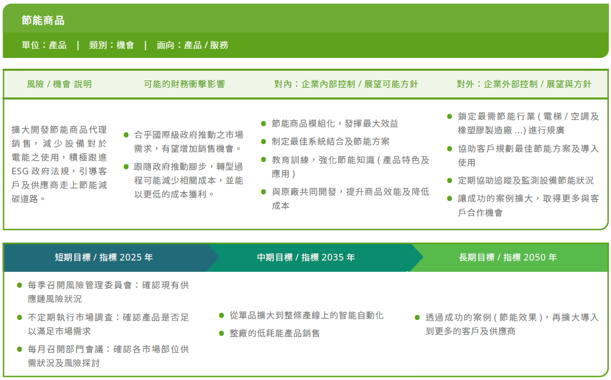 面對全球氣候變遷,本公司於2024 年依循氣候相關財務揭露框架(TCFD),鑑別可能對營運造成的重大性風險與機會,提出其相關應對策略,且訂定可持續管理之氣候相關指標與目標,為公司創造更大的利益與價值。