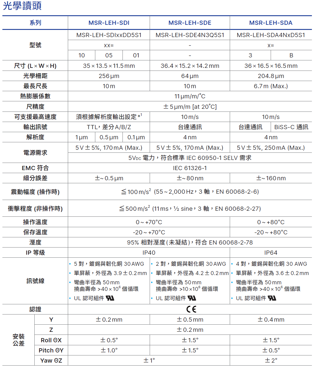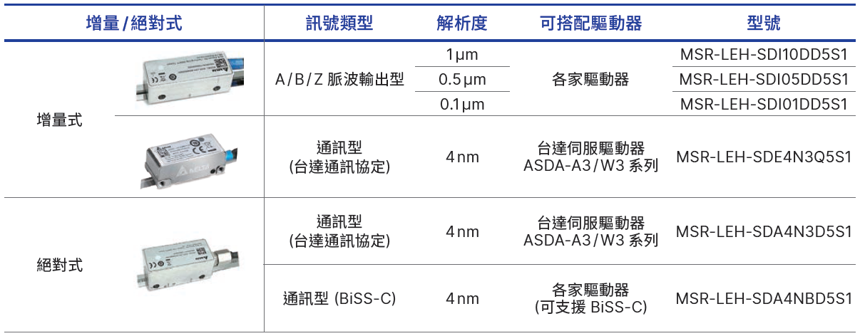 台達線性編碼器 MSR-LEH 為高精度的光學式線性編碼器,具高耐汙能力、漏脈波偵測與防爆衝特性 (搭配台達驅動器)。